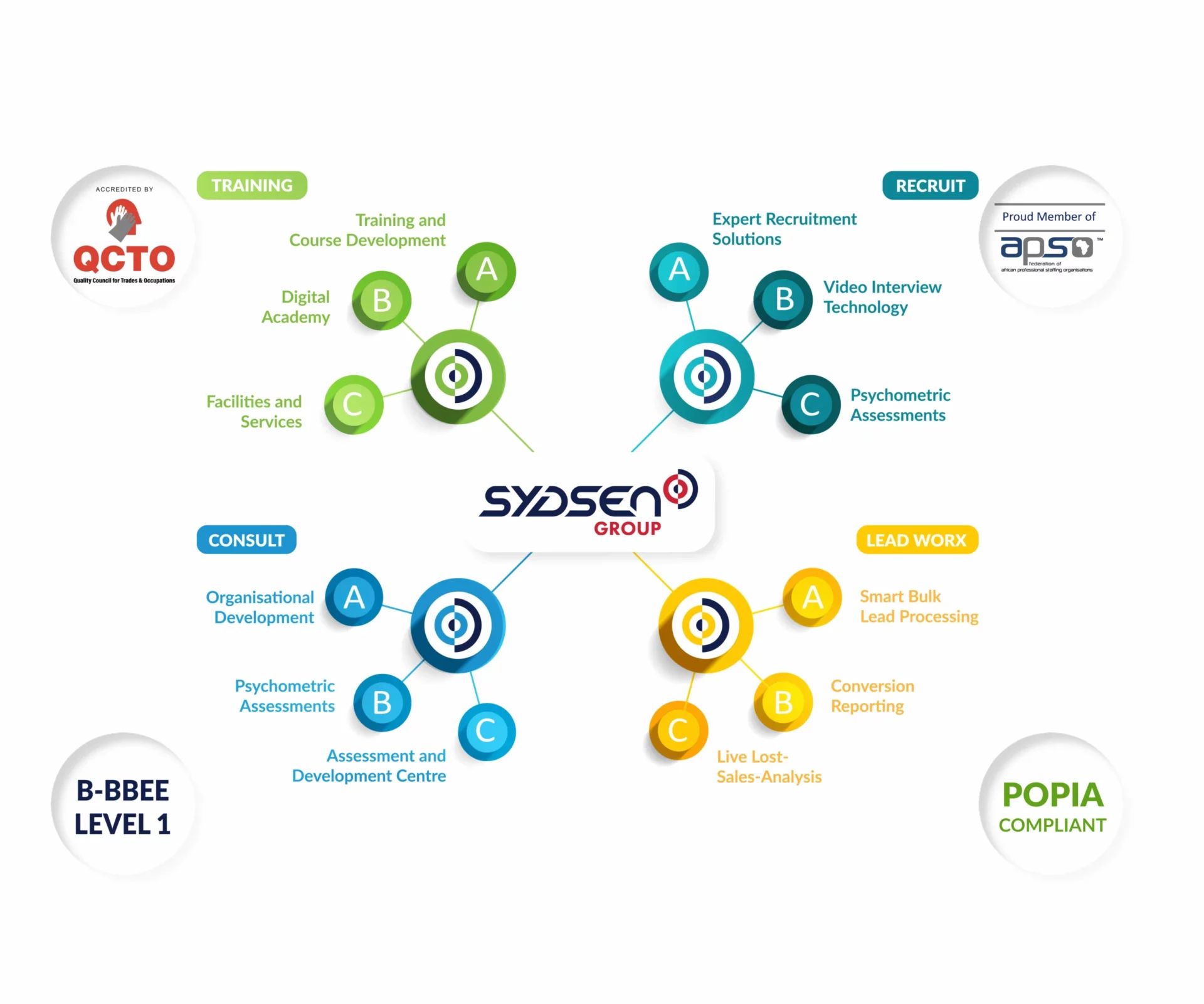 SydSen Recruit is a proud member of the SydSen Group, which offers a diverse range of services including Training and Development, Sales Call Centers, E-Learning Development, Hosting Facilitation, Digital Studio services, and Business Consulting.